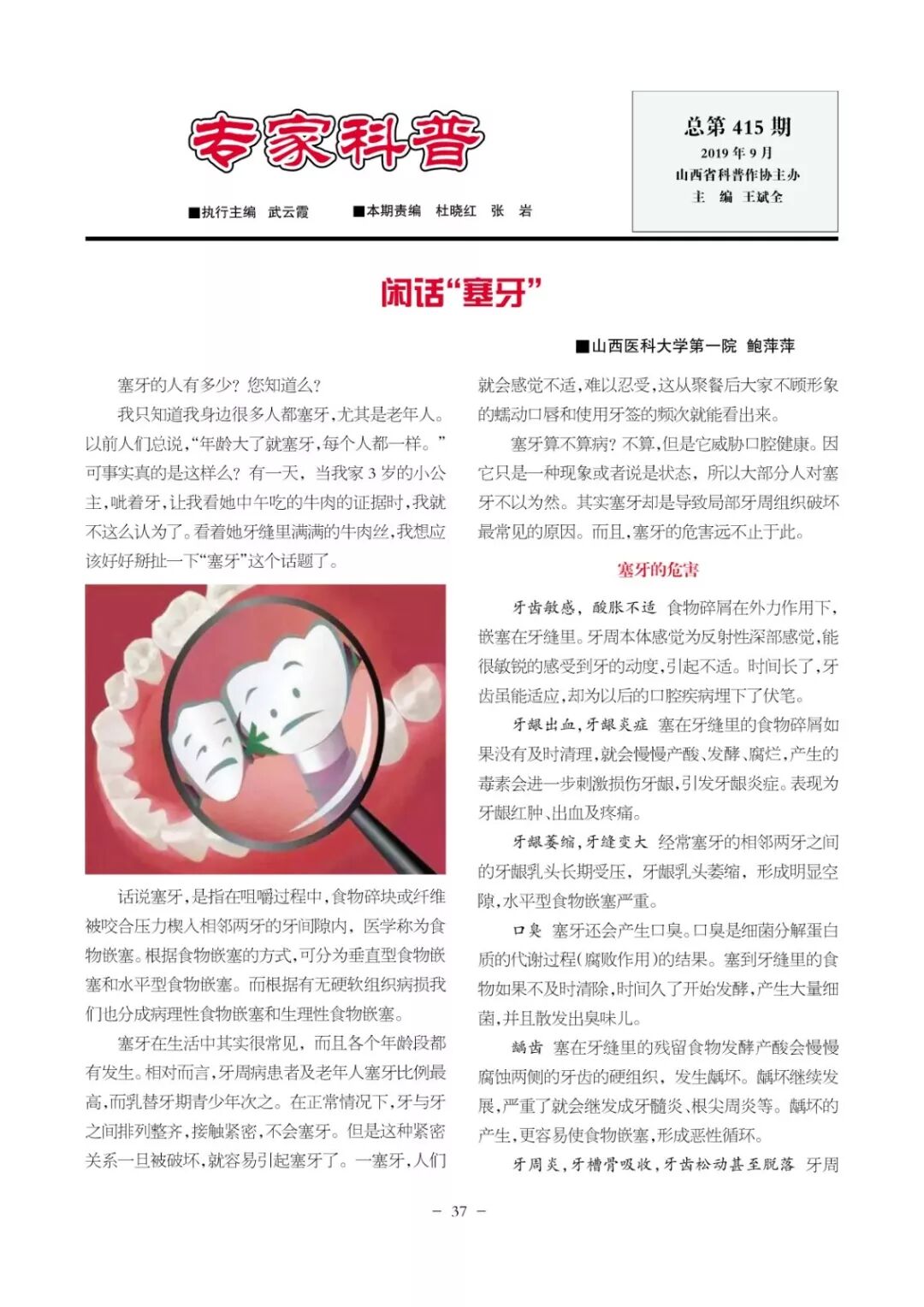 我只知道我身边很多人都塞牙,尤其是老年人。 以前人们总说,“年龄大了就塞牙,每个人都一样。”可事实真的是这样么?有一天,当我家3岁的小公主,呲着牙,让我看她中午吃的牛肉的证据时,我就不这么认为了。看着她牙缝里满满的牛肉丝,我想应该好好掰扯一下“塞牙”这个话题了。 话说塞牙,是指在咀嚼过程中,食物碎块或纤维被咬合压力楔入相邻两牙的牙间隙内,医学称为食物嵌塞。根据食物嵌塞的方式,可分为垂直型食物嵌塞和水平型食物嵌塞。而根据有无硬软组织病损我们也分成病理性食物嵌塞和生理性食物嵌塞。 塞牙在生活中其实很常见,而且各个年龄段都有发生。相对而言,牙周病患者及老年人塞牙比例最高,而乳替牙期青少年次之。在正常情况下,牙与牙之间排列整齐,接触紧密,不会塞牙。但是这种紧密关系一旦被破坏,就容易引起塞牙了。一塞牙,人们就会感觉不适,难以忍受,这从聚餐后大家不顾形象的蠕动口唇和使用牙签的频次就能看出来。 不算,但是它威胁口腔健康。因它只是一种现象或者说是状态,所以大部分人对塞牙不以为然。其实塞牙却是导致局部牙周组织破坏最常见的原因。而且,塞牙的危害远不止于此。 食物碎屑在外力作用下,嵌塞在牙缝里。牙周本体感觉为反射性深部感觉,能很敏锐的感受到牙的动度,引起不适。时间长了,牙齿虽能适应,却为以后的口腔疾病埋下了伏笔。 塞在牙缝里的食物碎屑如果没有及时清理,就会慢慢产酸、发酵、腐烂,产生的毒素会进一步刺激损伤牙龈,引发牙龈炎症。表现为牙龈红肿、出血及疼痛。牙龈萎缩,牙缝变大 经常塞牙的相邻两牙之间的牙龈乳头长期受压,牙龈乳头萎缩,形成明显空隙,水平型食物嵌塞严重。 塞牙还会产生口臭。口臭是细菌分解蛋白质的代谢过程(腐败作用)的结果。塞到牙缝里的食物如果不及时清除,时间久了开始发酵,产生大量细菌,并且散发出臭味儿。龋齿 塞在牙缝里的残留食物发酵产酸会慢慢腐蚀两侧的牙齿的硬组织,发生龋坏。龋坏继续发展,严重了就会继发成牙髓炎、根尖周炎等。龋坏的产生,更容易使食物嵌塞,形成恶性循环。 牙周炎不但具有牙龈组织炎症,它还造成牙周膜、牙槽骨和牙骨质的破坏。牙周支持组织破坏后不易再生,失去牙槽骨的支持,牙齿就会松动,甚至脱落。 长时间食物嵌塞,会引起龋齿,牙髓炎甚至根尖周炎症,而这些症状产生的疼痛会使人们在咀嚼时避开患侧,单侧咀嚼。单侧咀嚼致使下颌运动不对称,久而久之,导致面部不对称,甚至引起颞颌关节的疾病。 造成塞牙的原因有很多 其发生大多因为牙齿及牙周组织的变化 因龋坏,外伤,或自身发育不全造成缺损,发生在边缘嵴或邻面,破坏了边缘嵴的外形和相邻两牙的邻接。 理想的充填,能够恢复患牙的边缘嵴外形,排溢沟的形态,以及与邻牙恢复紧密的邻接关系。 因偏侧咀嚼,磨牙症或夜磨牙引起的不当磨耗。 牙周炎引起的牙齿松动,移位。 牙齿长期缺失,没有及时修复,使缺牙两侧的牙齿向缺牙区倾斜,破坏与其他牙齿的邻接。 各种错合,拥挤,稀疏,排列异常。 乳牙期塞牙,乳牙期的孩子由于颌骨不断发育,而乳牙大小不变,使两牙之间产生间隙,易塞牙。 牙齿龋坏,牙齿充填物缺损可以通过充填术,或制作嵌体或全冠等方式修复缺损,恢复正常牙冠外形和邻接以解决塞牙。 如果涉及多颗牙齿,则需在专用仪器辅助下,咬合重建。 严重牙周炎有牙槽骨吸收达到牙根的1/2时,可考虑制作牙周夹板。 无对伸长牙 根据情况调合或压低,并及时修复对缺牙。对于无对的智齿,建议拔除。对于阻生且影响邻牙的智齿建议拔除。 调选磨法调整牙尖高度和形态,用于矫治部分垂直型食物嵌塞。也可以通过选磨法重建食物排溢道,恢复牙齿正常的生理外形,调整边缘嵴,恢复外展隙。 可以制作活动式防嵌器,负压成型防嵌器来防止食物嵌塞。 由于乳牙间隙造成的塞牙可使用牙线等工具及时处理,严重的可以使用乳牙预成冠来阻止食物嵌塞。 正畸治疗排齐拥挤的牙齿。 直到现在,很多人依然觉得塞牙不是个事,只是不舒服,但是与健康无碍。在没有症状之前,我们感觉良好,这也导致很多人来看牙医时才知道自己的问题已经很严重了。所以,定期口腔检查可以让我们及时发现口腔的问题,尽早接受治疗。 请记住,塞牙不是病,却是很多病的开始。
