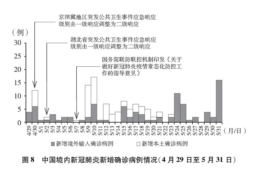 境内疫情总体呈零星散发状态,局部地区出现散发病例引起的聚集性疫情,境外输入病例基本得到控制,疫情积极向好态势持续巩固,全国疫情防控进入常态化。加大力度推进复工复产复学,常态化防控措施经受“五一”假期考验。经中共中央批准,国务院联防联控机制派出联络组,继续加强湖北省疫情防控。(图8)